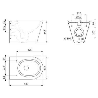 מחבת שירותים תלויה על הקיר, 360 על 350 על 535 מ”מ.